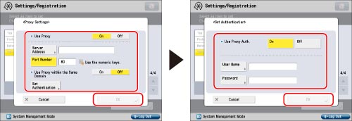 If you want to use proxy authentication, press [Set Authentication] → press [On] for <Use Proxy Auth.>. Press [User Name] → enter the user name to use for proxy authentication → press [OK]. Press [Password] → enter the password to use for proxy authentication → press [OK]. On the Confirm screen, enter the same password to confirm the password → press [OK].