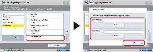To verify an IPv6 address: Press [IPv6 Address] → enter an IPv6 address that exists on the network → press [Start]. Press [OK] when the result of executing the PING command appears on the touch panel display.