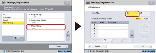 Press [IPSec Settings] for [TCP/IP Settings] → [On] for <Use IPSec>.
