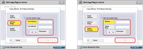 To specify a range of IPv4 addresses: Press [Address Range] → press [First Address] → enter the first IPv4 address → press [Last Address] → specify the last IPv4 address.