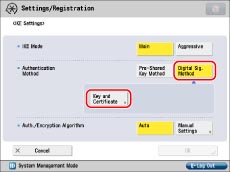 Press [Digital Sig. Method] for <Authentication Method> → [Key and Certificate].