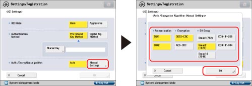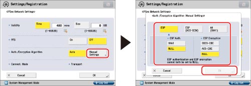 Select [Manual Settings] for <Auth./Encryption Algorithm> → specify the authentication and encryption algorithm to apply to the IKE SA → press [OK].