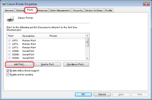 In the [Printer Ports] dialog box, select [Standard TCP/IP Port] from [Available ports types]/[Available port types] → click [New Port].