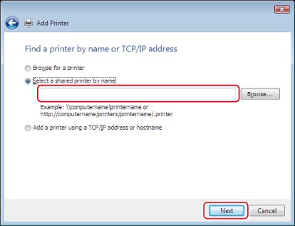 Windows Vista/Server 2008/7: Select [Add a network, wireless, or Bluetooth printer] → [The printer that I want isn't listed] → [Select a shared printer by name].