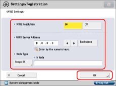 If you want to use WINS name resolution, press [On] for <WINS Resolution>. Enter the IP address of a WINS server in [WINS Server Address].