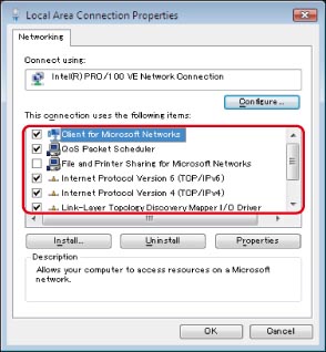 In the [Local Area Connection Properties] dialog box, select [Client for Microsoft Networks] and [Internet Protocol (TCP/IP)]/[Internet Protocol Version 4 (TCP/IPv4)].