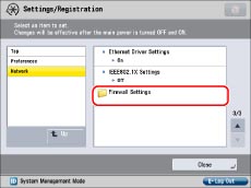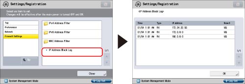 When IP addresses have been set so that data transmission and reception with the machine is denied, and data transmission and reception is attempted between the machine and the devices having those IP addresses, a block log is recorded. The procedure for referring to the block log is described below.