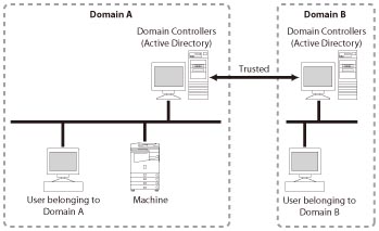 In the example below, users belonging to Domain A (which includes the machine), and users belonging to Domain B (which is bi-directionally trusted by Domain A), can be authenticated, and users registered in the machine itself can be authenticated. The user selects the location to log in to (domain name or [This device]) when logging in.