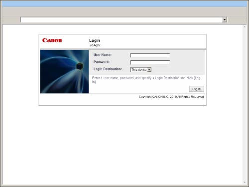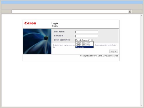 The names of the domains which allow user authentication are displayed in the Login Destination drop-down list in alphabetical order. However, regardless of the items displayed in the Login Destination drop-down list, the domain which the machine belongs to is displayed at the top of the list, and [This device] is displayed at the bottom of the list.