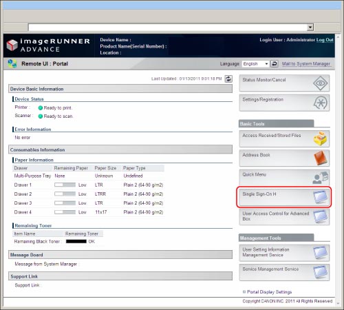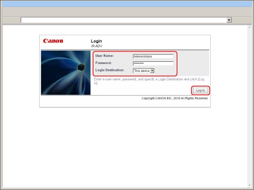 To log in from the Remote UI Portal, set [Remote UI] in [License/Other] in [Management Settings] (Settings/Registration) to 'On'. (See "Before You Start the Remote UI.")