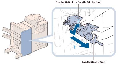 2. Pull the stapler unit of the saddle stitcher unit towards you, and then push it up.