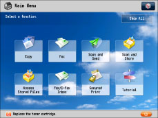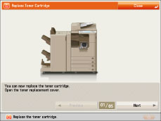 Complete instructions on how to replace the toner cartridge can be accessed by pressing [Previous] or [Next] on the touch panel display