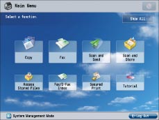 If [Department ID Management] is set to 'On', and if a function restricted by Limit Functions is set for the default screen, the Main Menu screen appears at startup. (If [Department ID Management] is set to 'On', [Copy] is restricted by Limit Functions.) To display the function you set for the default startup screen, select the function on the Main Menu screen → enter the Department ID/PIN on the Log In screen.