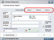 Forwarding settings for received files not stored in memory are not displayed, even if you press a button for <Previous Settings>.