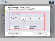 The [Adjust Background/Character Contrast] setting is canceled when the job is complete. If you want to use the same settings for the next copy job, specify the setting again.