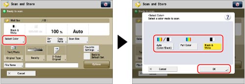You can register a desired color mode as the default setting by changing the default scan settings. (See "Specifying the Scan and Store Settings.")