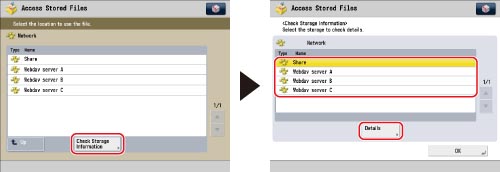 Press [Check Storage Information] → select the desired storage location → press [Details].