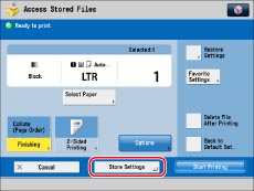 You can store the following print settings and modes: the number of printouts, Select Paper, 2-Sided Printing, Finishing, Cover, Insert Sheets, Booklet, and Gutter.