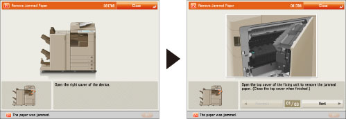 If paper is jammed in several locations, remove the jammed paper in the order indicated on the touch panel display.