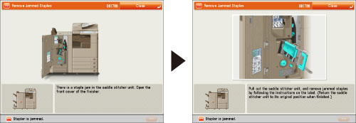If a staple jam occurs, a screen indicating the location of the staple jam and how to clear the jam appears on the touch panel display. Follow the instructions on the screen to clear the staple jam. The screen is displayed repeatedly until the staple jam is cleared. If you press [Close], you can continue operations, such as setting modes or scanning originals, even if the jammed staple is not removed immediately.