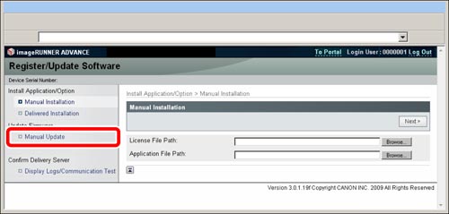 From the portal page of the Remote UI, click [Settings/Registration] → [License/Other] → [Register/Update Software].