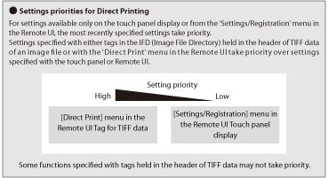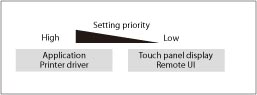The most recently specified settings take priority for settings available only on the touch panel display or Remote UI.