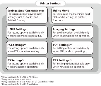 You can specify many settings which affect the printer function of the machine. These include some settings that cannot be specified remotely from an application or from the printer driver. These settings are referred to as Menu Functions.