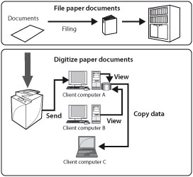 Without the need for a separate delivery server, anyone with access to an imageRUNNER ADVANCE machine and a computer can digitize paper documents with ease.