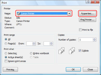 Select [Print] from the [File] menu of the application software you are using for the document to print → display the [Print] dialog box → click [Preferences].