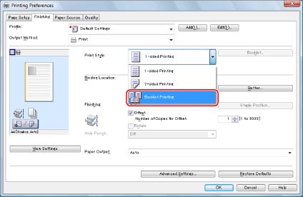 In the [Finishing] sheet, select [Booklet Printing] from [Print Style].