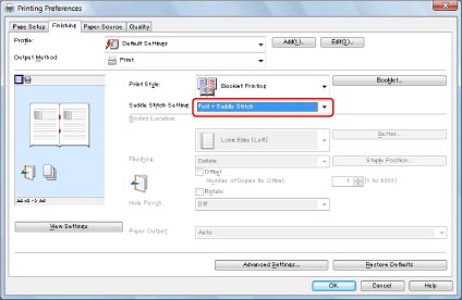 Select [Fold + Saddle Stitch] from the [Saddle Stitch Setting] drop-down list → click [OK] → [OK].