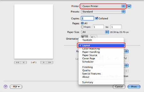 Select the printer to use → select the [Layout].