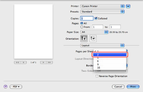 Select [2] (the number of pages to be printed on each side of a sheet of paper) for [Pages per Sheet].