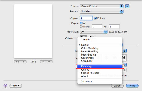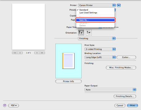 You can store the settings specified in each panel of the [Print] dialog box on your Mac as presets. A preset is a combination of frequently used print functions saved as a single setting. You can print with ease by simply selecting a registered preset according to your needs.