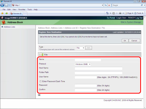 From the [Type] drop-down list, select [File] → specify the information for each item on the register destinations screen.
