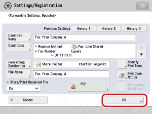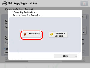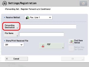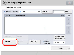 (Settings/Registration) → [Function Settings] → [Receive/Forward] → [Common Settings] → [Forwarding Settings] → [Register].