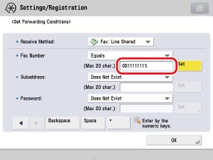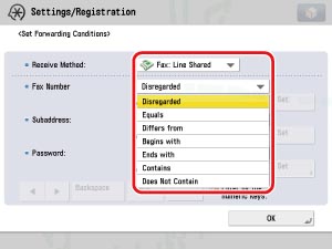 The registered fax number for the sender may contain irregularities such as "dial zero", spaces, or the country code. Forwarding conditions may change depending on such irregularities. If you are unsure of the presence of irregularities, select [Contains] instead of [Equals].