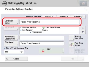 Press [Condition Name] → enter 'Faxes from Company A'.
