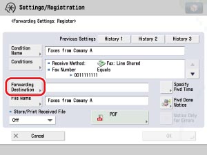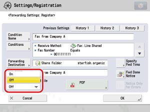 Take note that if the forwarding condition is set to 'Off', faxes are output instead of automatically forwarding to a computer.