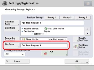 You can enter a desired file name. The specified name will be used for files forwarded to and stored in the shared folder.