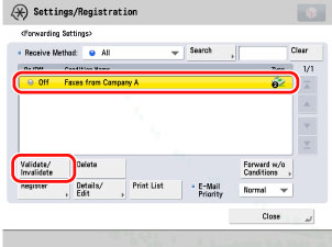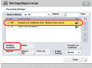 Select the registered forwarding condition → press [Validate/ Invalidate] to set the forwarding condition to 'On'.