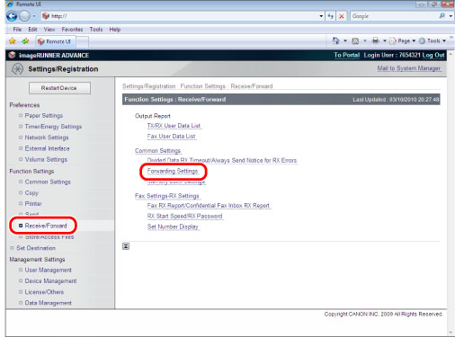 Access the Remote UI → click [Settings/Registration] → [Receive/Forward] → [Forwarding Settings].