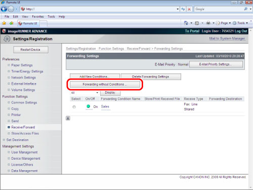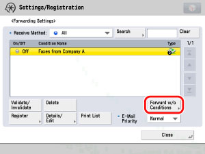(Settings/Registration) → [Function Settings] → [Receive/Forward] → [Common Settings] → [Forwarding Settings] → [Forward w/o Conditions].