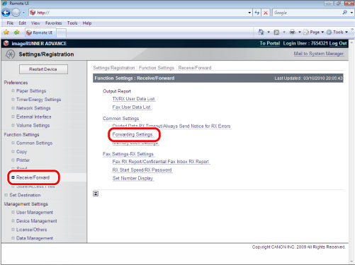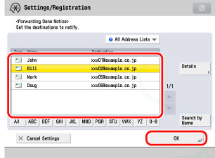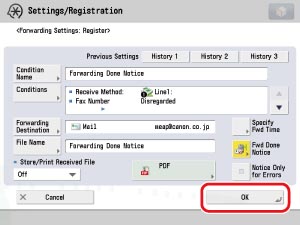 (Settings/Registration) → [Function Settings] → [Receive/Forward] → [Common Settings] → [Forwarding Settings] → [Register]→ specify each setting.