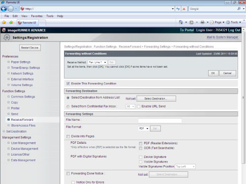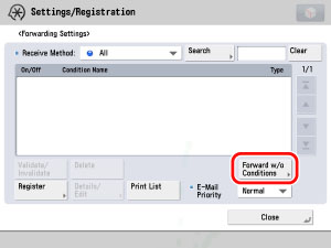 (Settings/Registration) → [Function Settings] → [Receive/Forward] → [Common Settings] → [Forwarding Settings] → [Forward w/o Conditions].