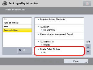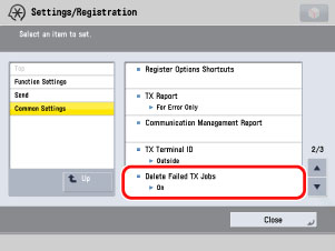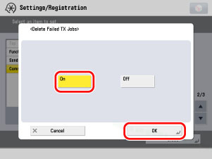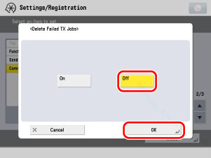 (Settings/Registration) → [Function Settings] → [Receive/Forward] → [Common Settings] → [Delete Failed TX Jobs].