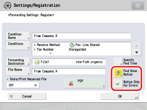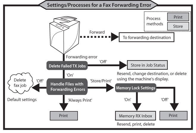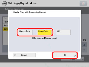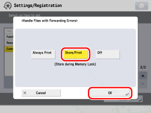 (Settings/Registration) → [Function Settings] → [Receive/Forward] → [Common Settings] → [Handle Files with Forwarding Errors] → select [Store/Print] → press [OK].