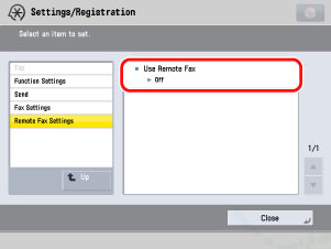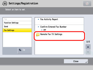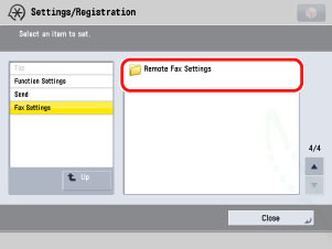 (Settings/Registration) → [Function Settings] → [Send] → [Fax Settings] → [Remote Fax Settings].