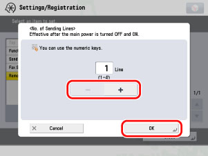Press [-] or [+] to set the number of telephone lines to use → press [OK].