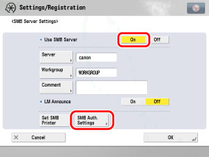 Press [SMB Auth. Settings] → set [Use SMB Authentication] to 'On'.